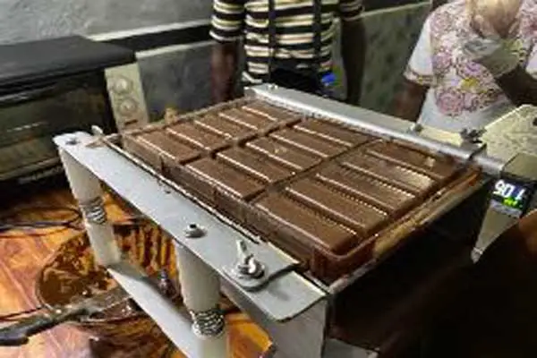 Warm Chocolate is poured into molds and cooled. Then wrapped and taken to the marketplace