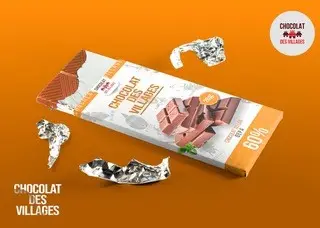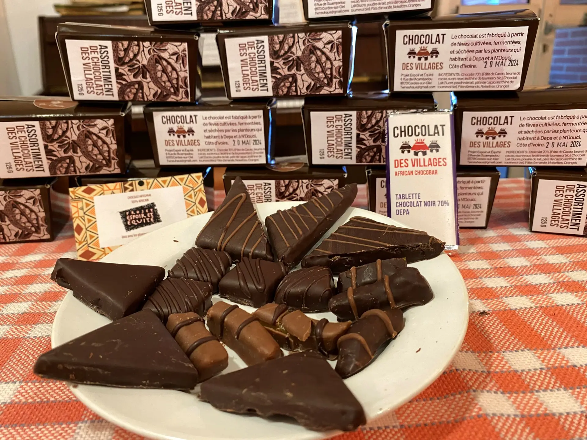 Village made chocolate. Cocoa beans from the local village farmers. After drying they are brought to the Chocolat des Villages artisan factory for roasting. Then they are ground into chocolate paste. Sugar and cocoa butter are added to create these wonderful chocolates. Discover the flavors of natural chocolate